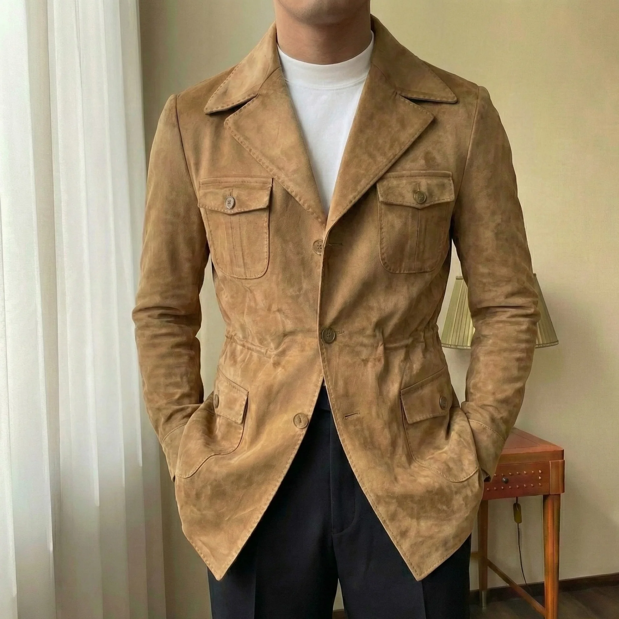 The luxurious suede material exudes elegance, while the sharp collar adds a touch of sophistication. Four strategically placed pockets ā two on the chest and two at the front ā offer both functionality and a fashionable accent, ensuring you'll always look sharp and feel prepared. This jacket becomes an essential part of your wardrobe, catering to those who value both convenience and a free-spirited approach to fashion.